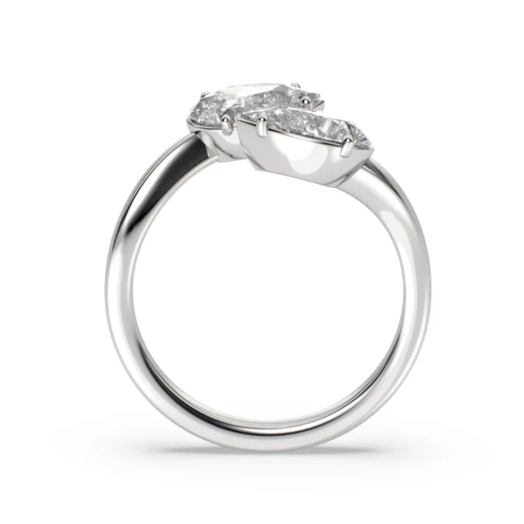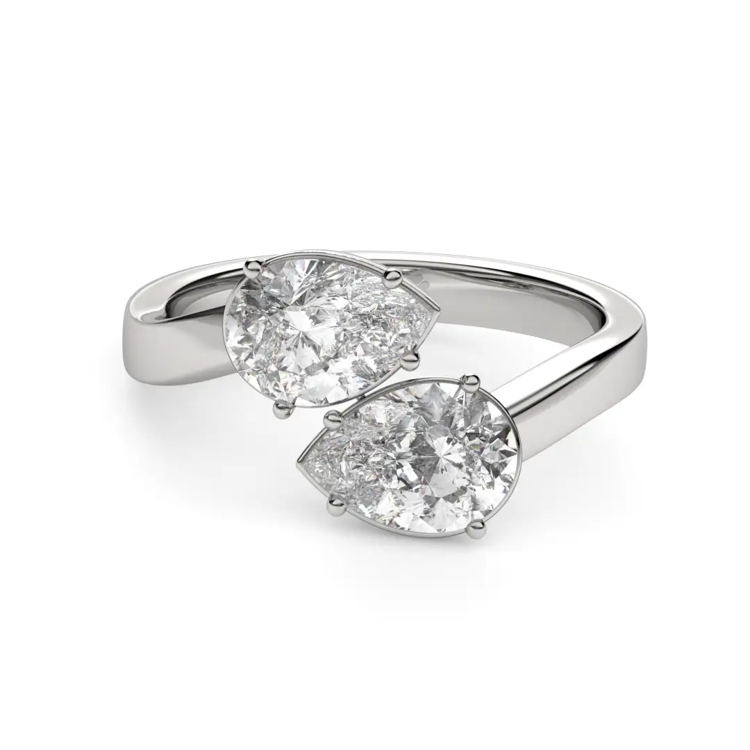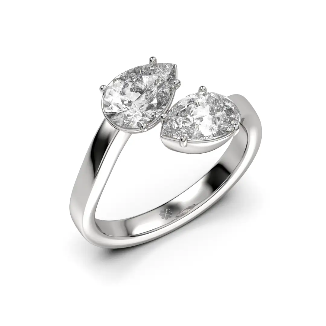 El anillo de compromiso MAO Gemina celebra la simetría y la conexión a través de un diseño contemporáneo y lleno de significado. Dos diamantes de corte pera se enfrentan en perfecta armonía, creando una composición elegante y equilibrada que simboliza la unión de dos caminos que se encuentran.