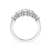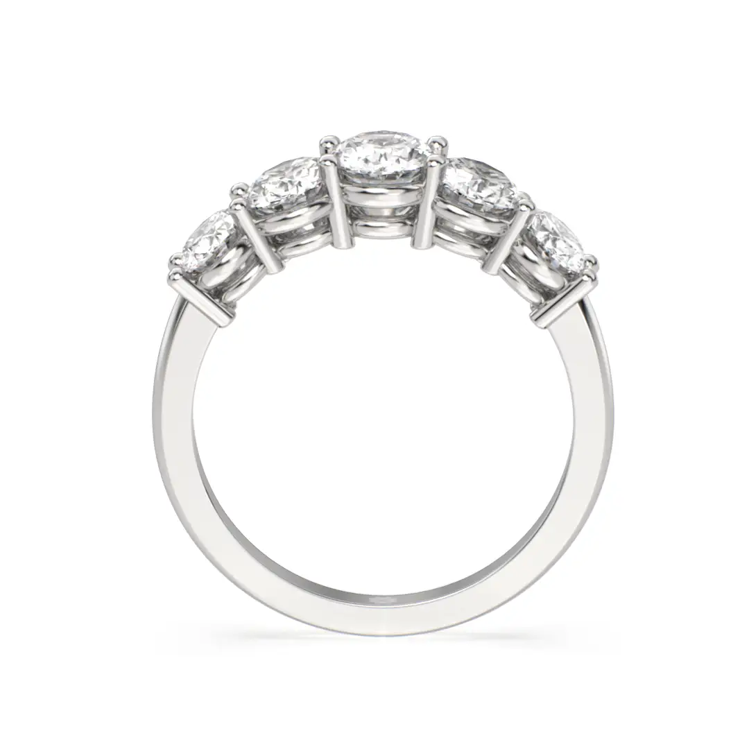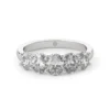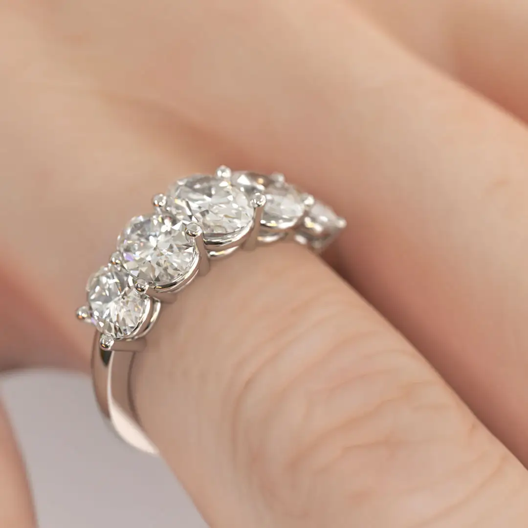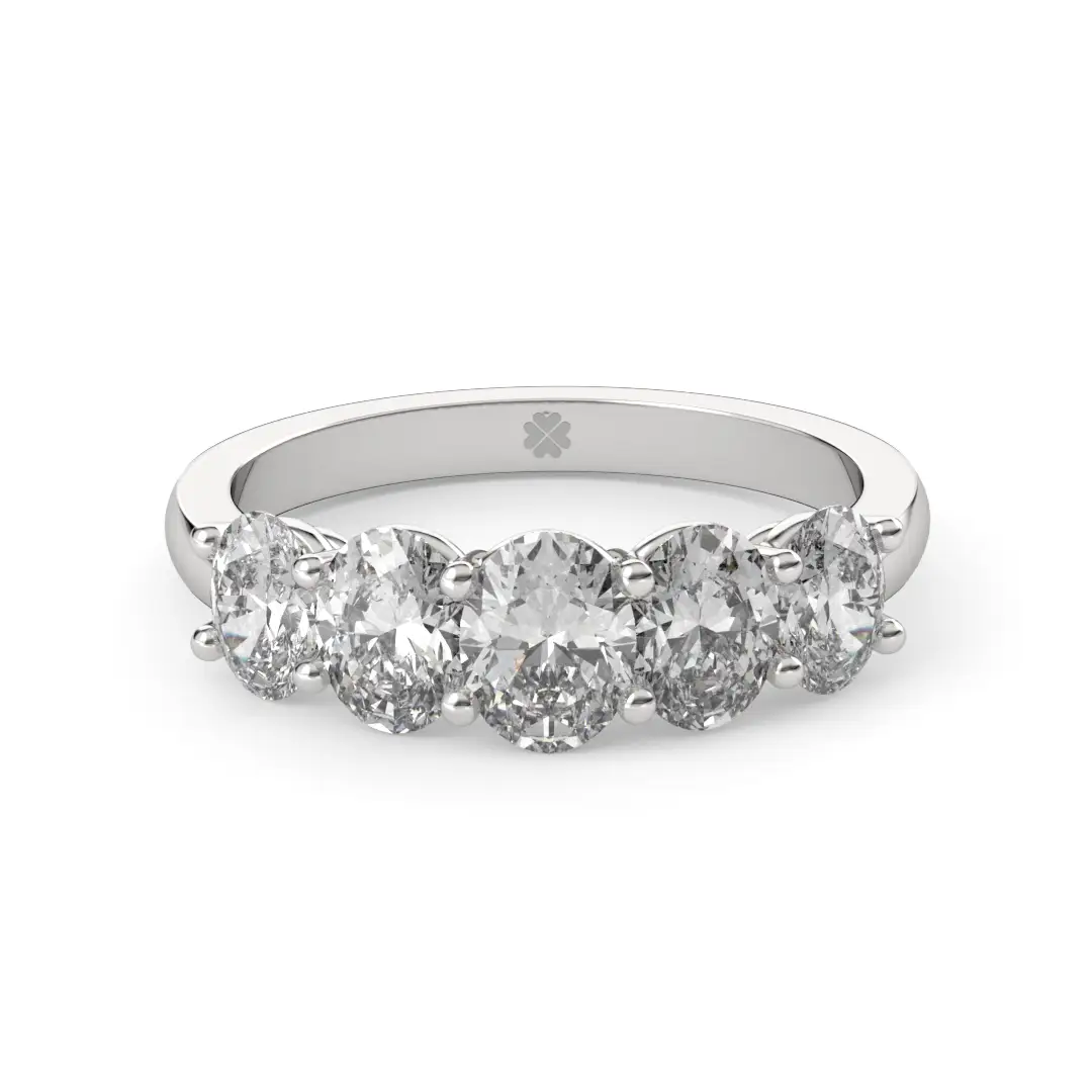 La forma oval de cada diamante aporta una sensación de mayor presencia y fluidez visual, realzando el brillo y alargando delicadamente la silueta del anillo. Cada piedra comparte el mismo protagonismo dentro del conjunto, logrando una composición armónica, limpia y atemporal.