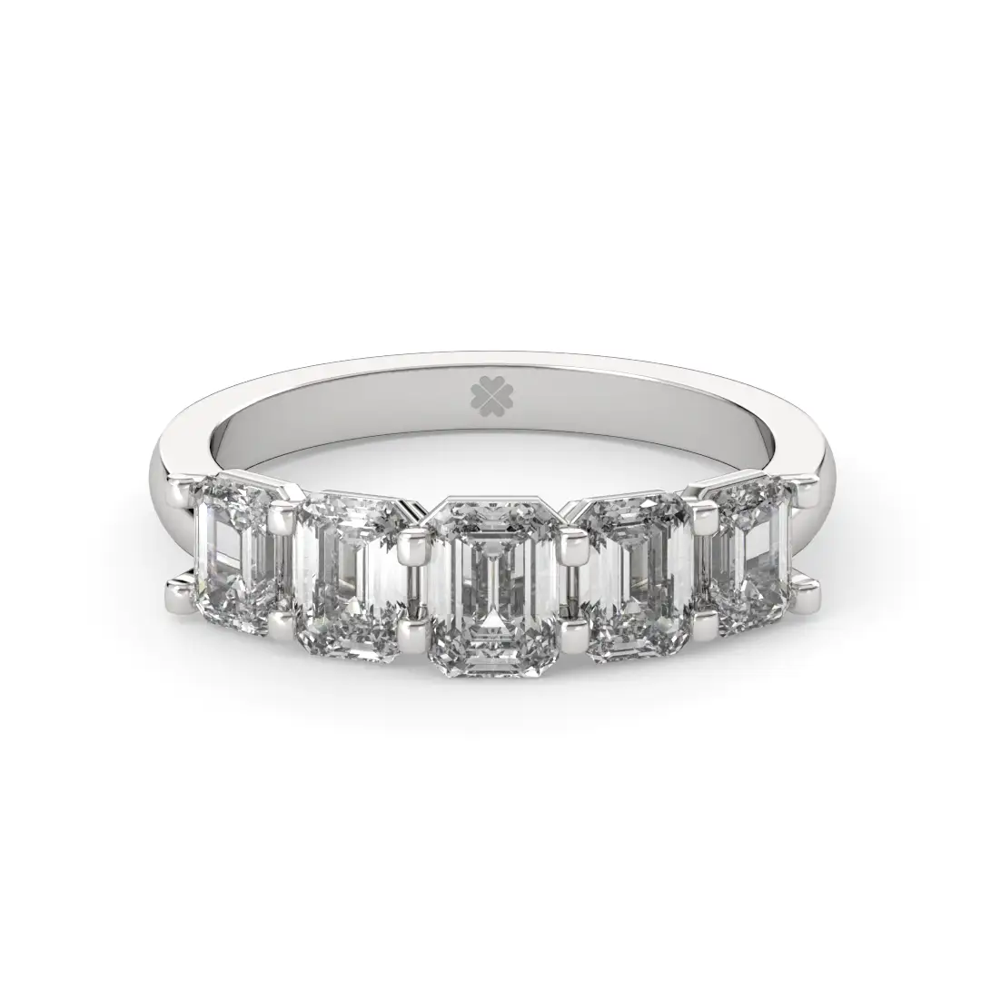 El corte esmeralda destaca por su estructura geométrica y su brillo sutil y profundo, aportando una estética refinada y moderna. Cada diamante comparte el mismo protagonismo dentro del conjunto, logrando una armonía perfecta entre luz, forma y proporción.