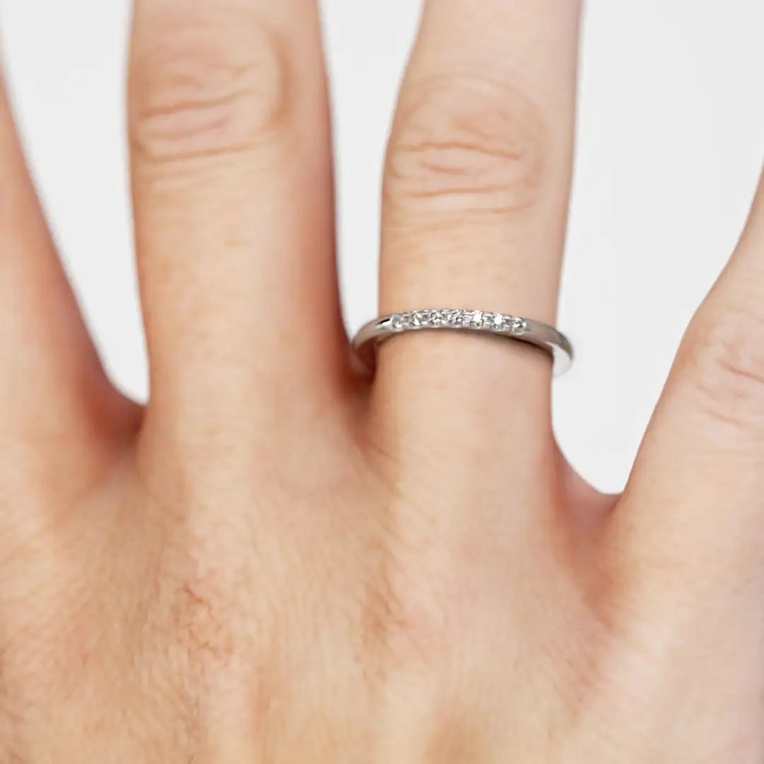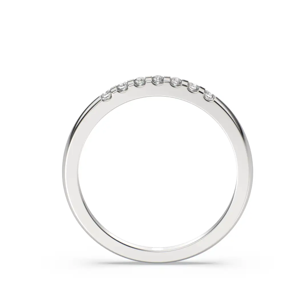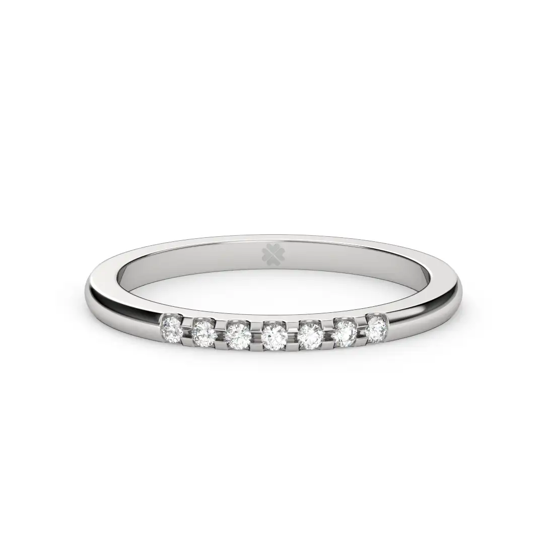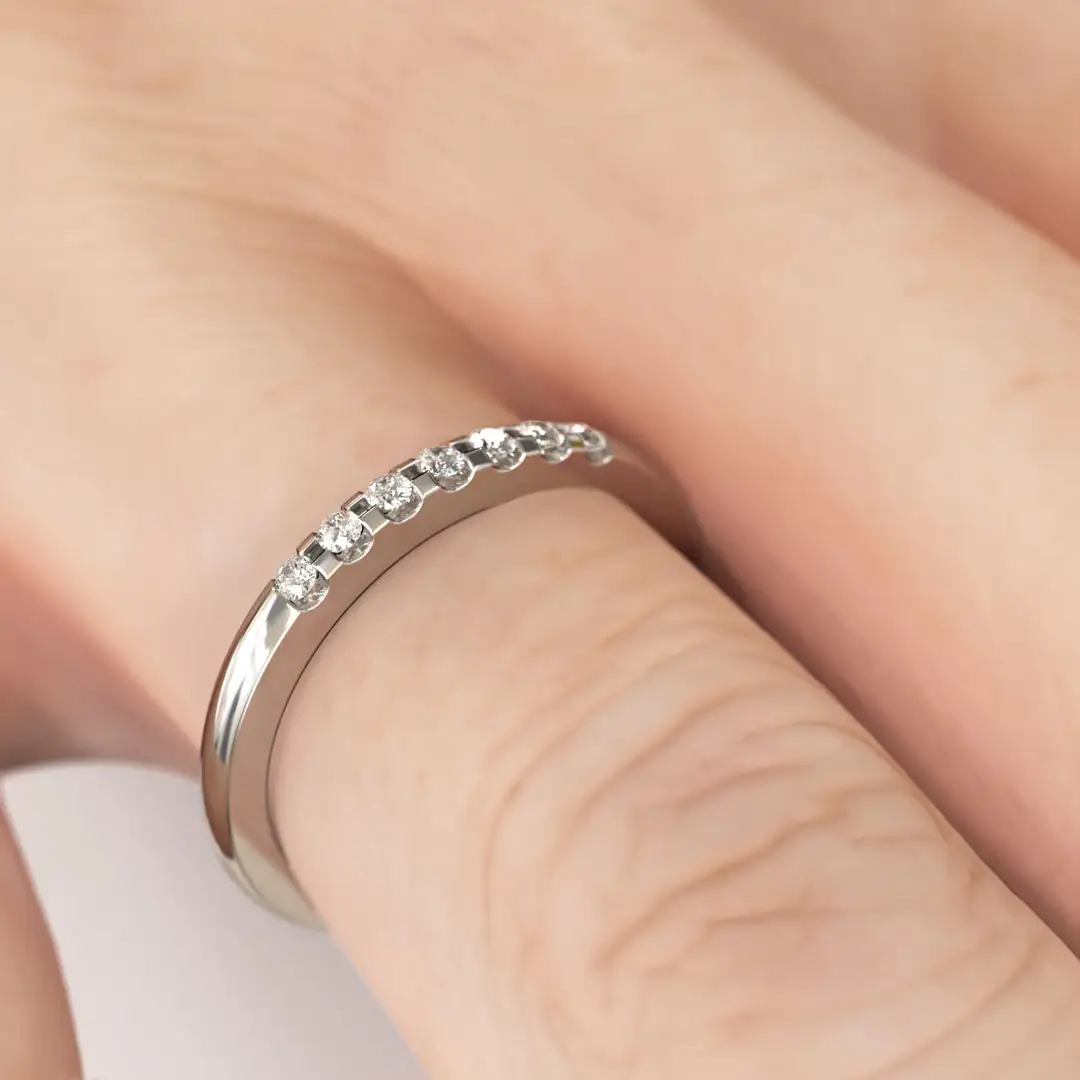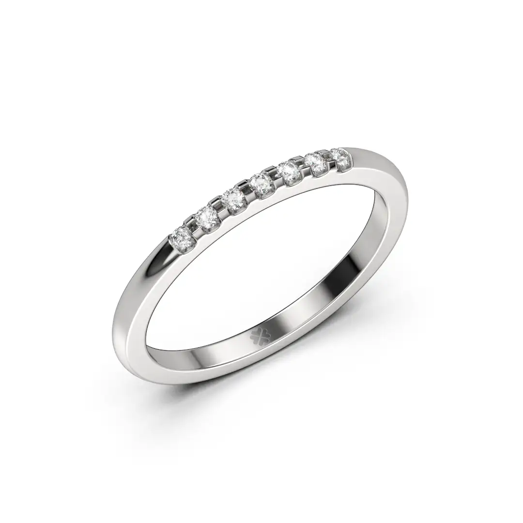 Descubre la sofisticación sutil del Anillo Eros, una joya de líneas limpias y elegancia contemporánea que celebra el brillo en su forma más pura. Este delicado anillo se distingue por una hilera de 7 diamantes de corte brillante, cuidadosamente engastados para permitir el paso de la luz de manera lateral, potenciando su luminosidad natural y creando un resplandor continuo y armónico.