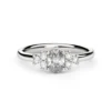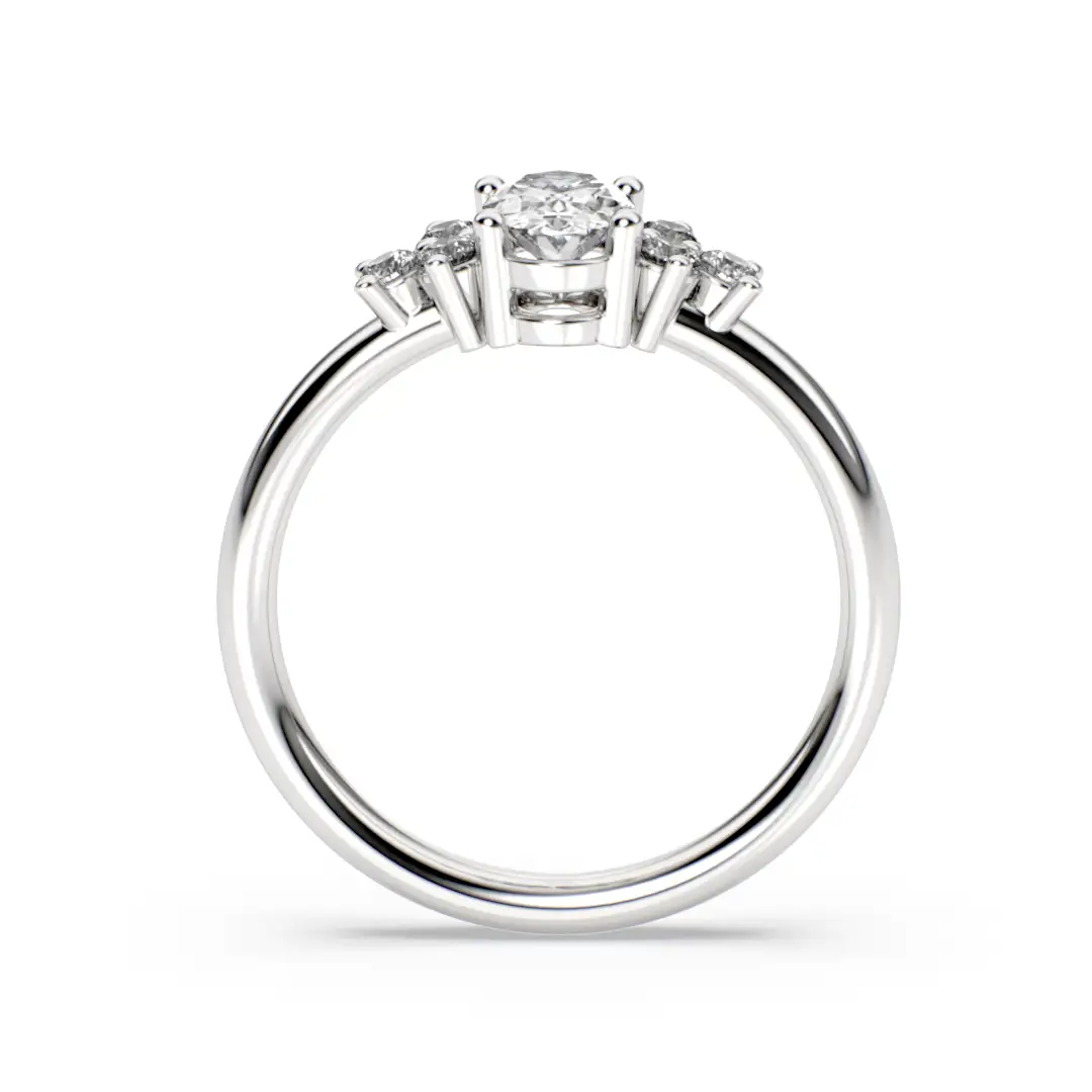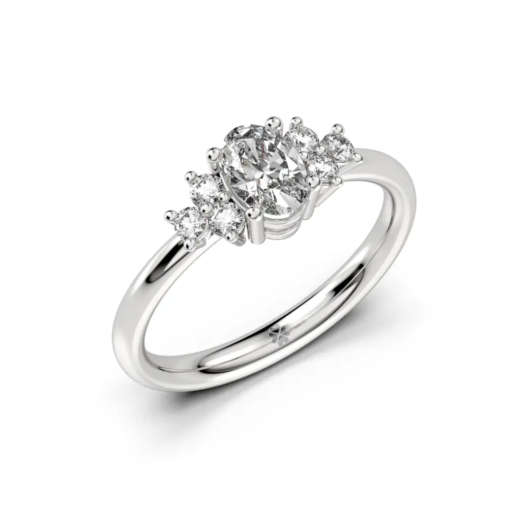 En el centro del diseño, un diamante de corte oval se convierte en el protagonista absoluto, acompañado a cada lado por tres diamantes de corte brillante de 3 puntos, que realzan su luminosidad y crean una composición envolvente y armoniosa. La forma alargada del diamante central aporta elegancia y presencia, mientras que el conjunto lateral suma profundidad y un resplandor continuo desde cualquier ángulo.