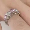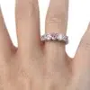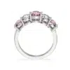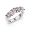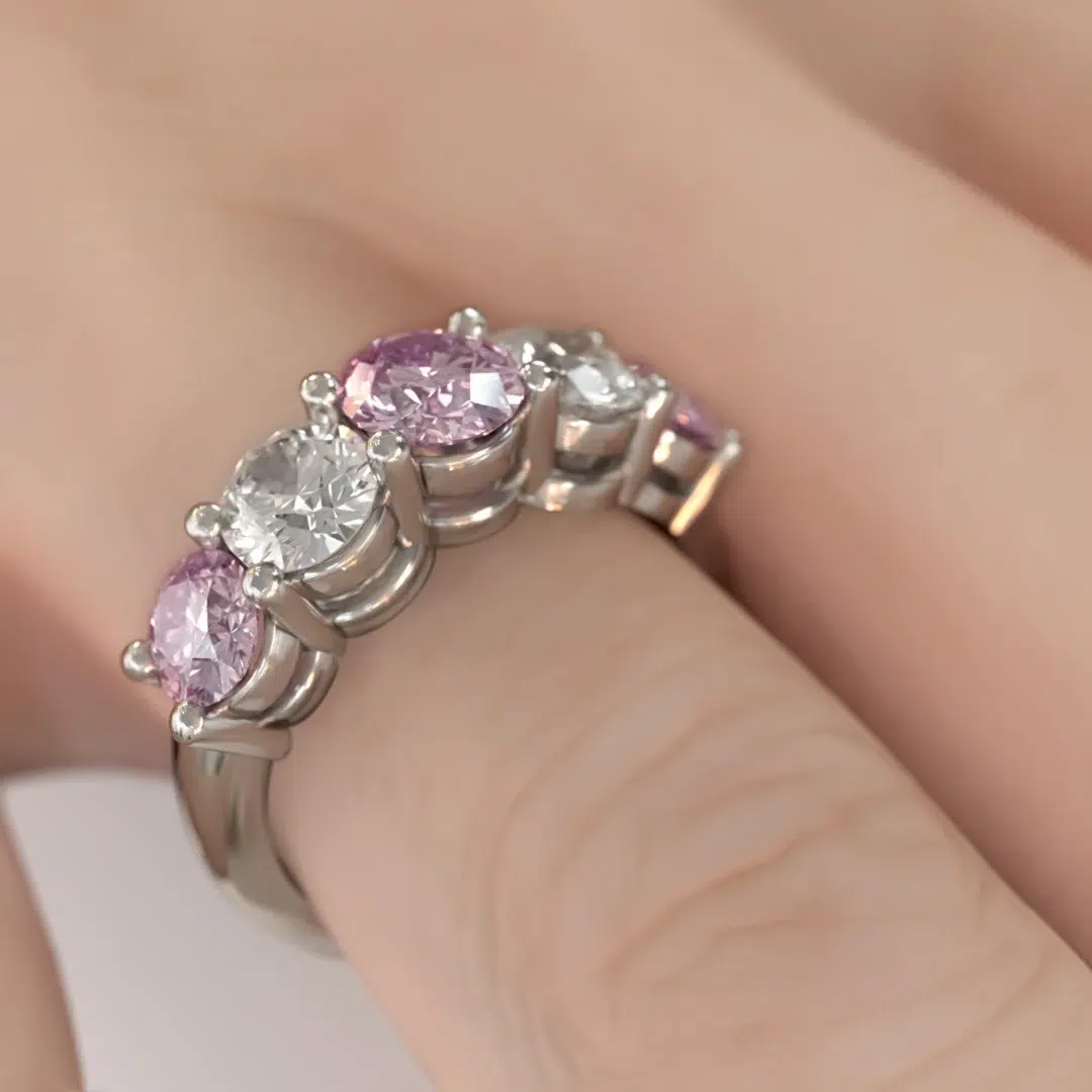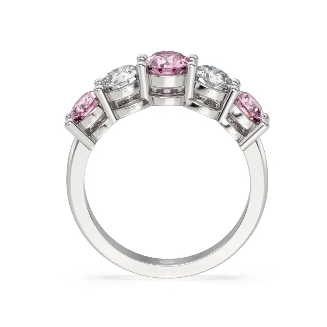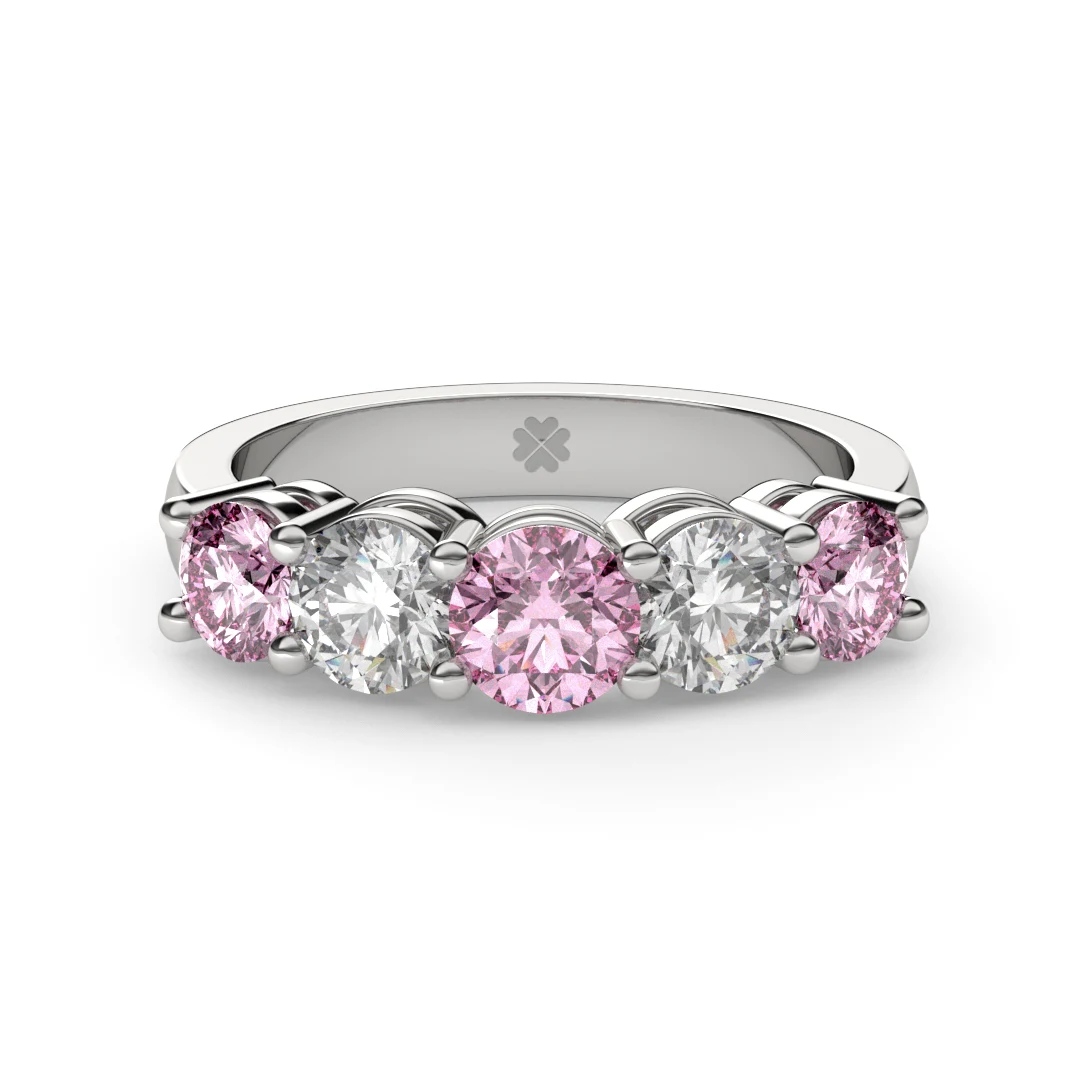 En el centro, un impactante diamante rosa se convierte en el protagonista absoluto, irradiando profundidad y luminosidad. A cada lado, dos diamantes blancos deslumbrantes realzan su presencia, aportando contraste y una claridad impecable. Finalmente, dos diamantes rosa en los extremos completan la pieza, creando una transición cromática suave y elegante que distingue a este modelo de manera única.