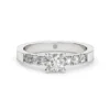Este anillo presenta un diseño estilizado con diamantes laterales de corte brillante cuidadosamente engastados que acompañan y potencian la presencia de un diamante central mayor, creando una línea de luz continua y sofisticada. Cada destello se integra en una silueta fluida y equilibrada que realza la pureza del diseño y la intensidad del resplandor.