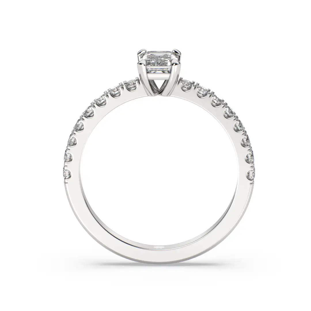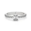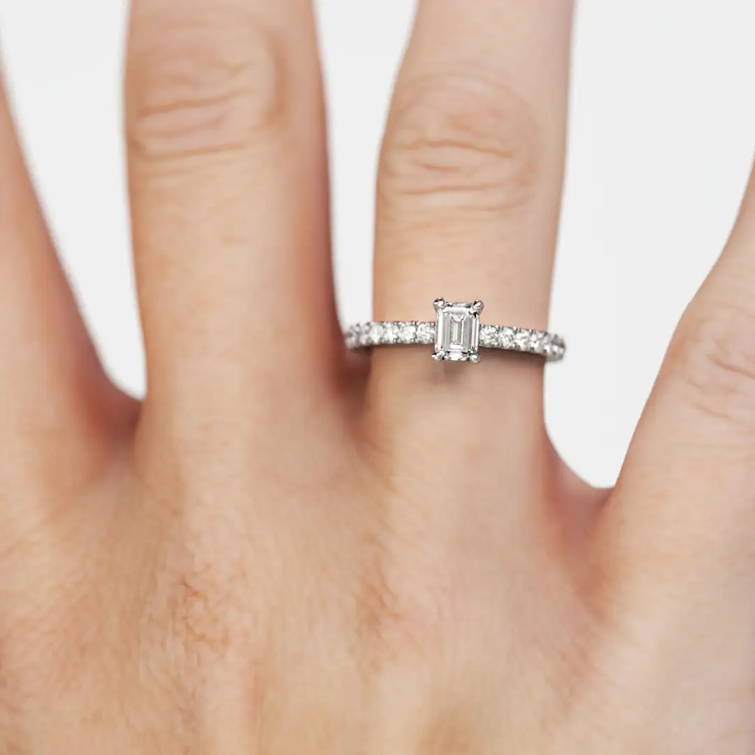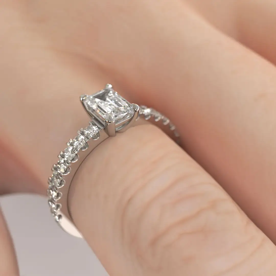 Descubre nuestro anillo de compromiso MAO Concordia, un solitario neoclásico que destaca por su elegancia serena y sofisticada. Su diseño delicado presenta un diamante central de corte esmeralda, protagonista absoluto, acompañado por una fina línea de diamantes de corte brillante que recorren el cuerpo del anillo, realzando su luminosidad con equilibrio y sutileza. La armonía de sus proporciones permite un acople perfecto con la futura Argolla de Matrimonio, creando un conjunto refinado y atemporal. Concordia es una joya pensada para simbolizar la unión perfecta entre estilo, luz y amor eterno.