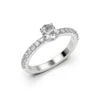 Descubre nuestro anillo de compromiso MAO Foedus, un solitario neoclásico que encarna la promesa de un amor eterno. Su diseño elegante y equilibrado resalta un diamante central de corte oval, acompañado por una delicada hilera de diamantes de corte brillante que recorren el cuerpo del anillo, aportando un brillo continuo y refinado. La pureza de sus líneas permite un acople perfecto con la futura Argolla de Matrimonio, formando un conjunto armónico y atemporal. Foedus es una joya creada para sellar un pacto de amor profundo, luminoso y duradero.