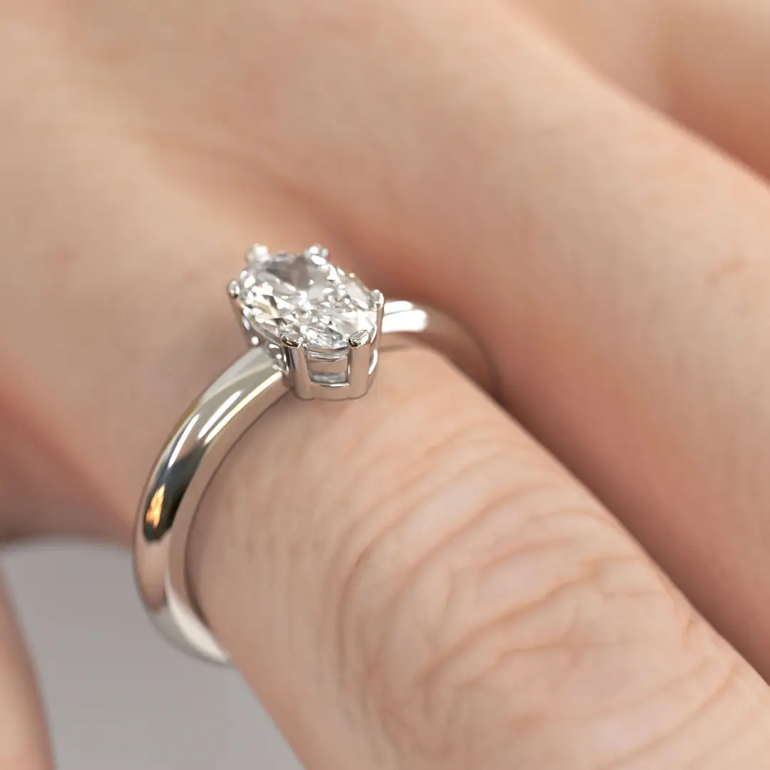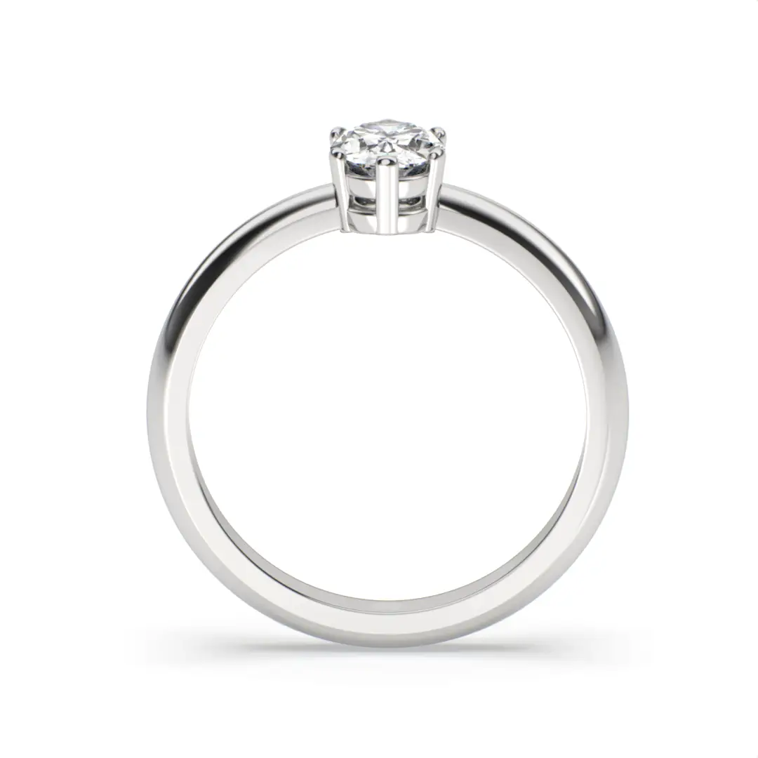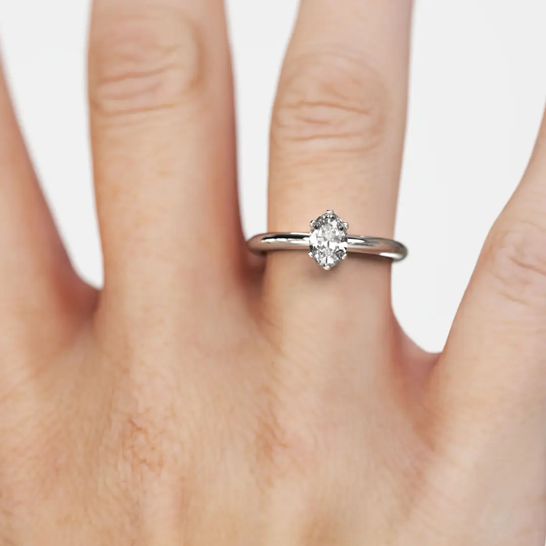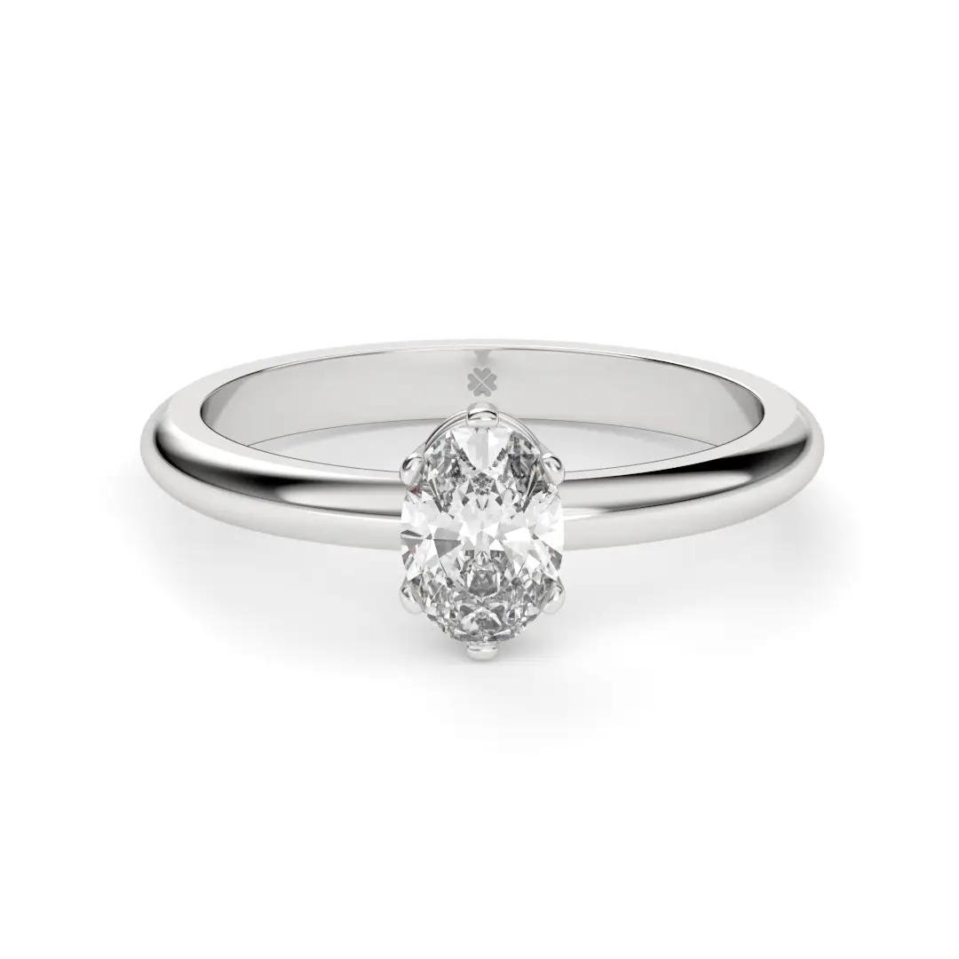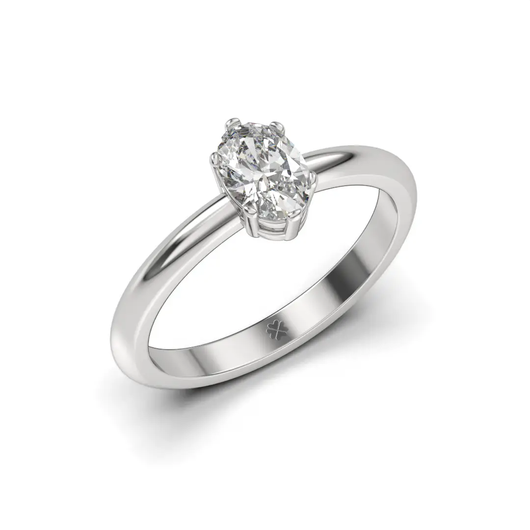 Este diseño deposita todo el protagonismo en un diamante central de corte oval, cuidadosamente engastado para maximizar su brillo y permitir que la luz fluya con naturalidad desde cada ángulo. Su cuerpo liso y armonioso realza la piedra principal, creando una composición equilibrada y atemporal que nunca pasa de moda.