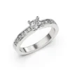 Nuestro anillo de compromiso MAO Splendia es un solitario de líneas refinadas que destaca por su elegancia atemporal y su delicado equilibrio de brillo, ideal para una novia clásica y sofisticada. Su diseño estilizado presenta un diamante central de mayor tamaño, realzado por una fila de diamantes de corte brillante cuidadosamente engastados a cada lado, aportando luminosidad sin perder ligereza visual.