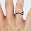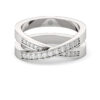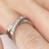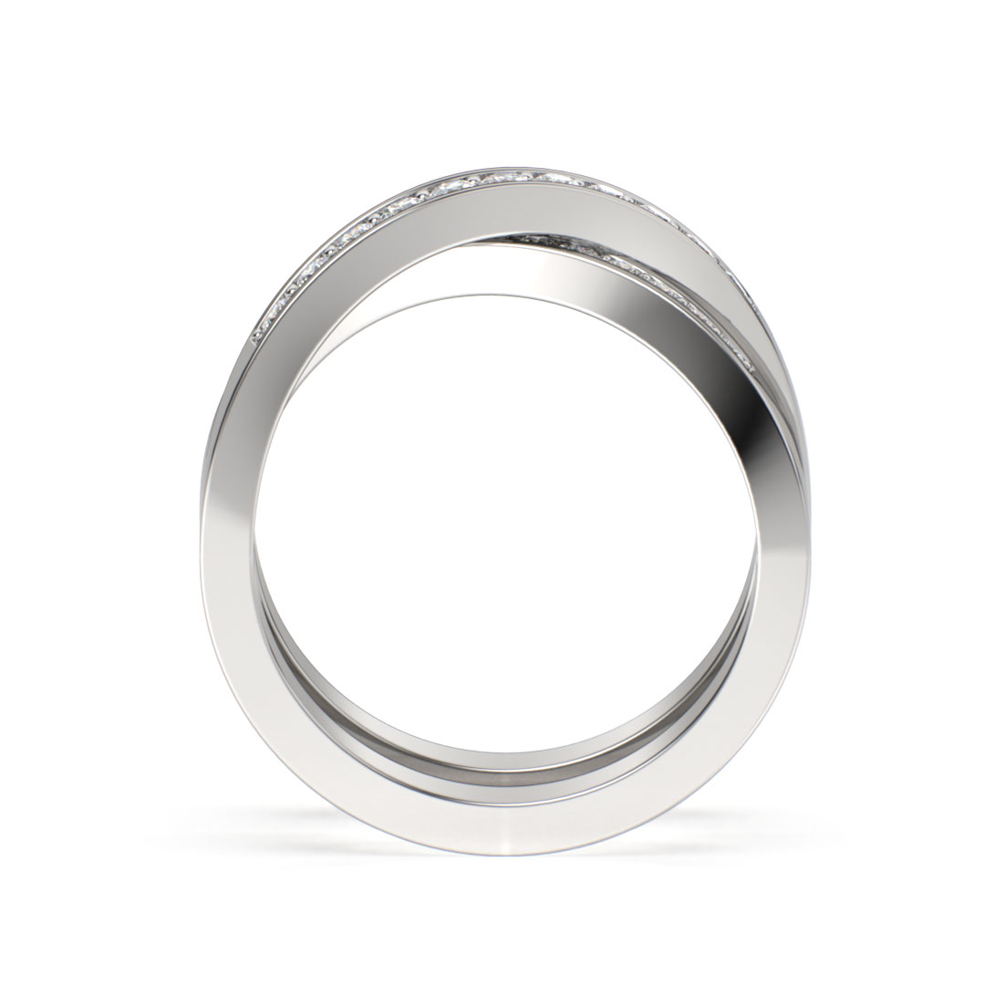 Es un cintillo contemporáneo, este anillo de compromiso destaca por su diseño dinámico y desafiante, para una novia innovadora. Un cuerpo de líneas cruzadas, que evocan el símbolo del infinito. Con diamantes corte brillante en las dos líneas frontales, otorgan un brillo envolvente.