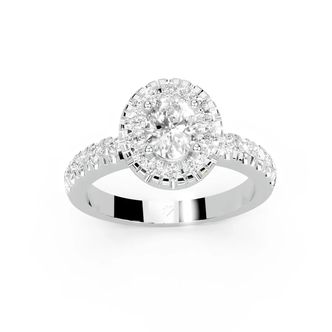 Un solitario deslumbrante, con un halo de 14 diamantes corte brillante que realzan la elegancia del diamante central ovalado. Ideal para la novia sofisticada que busca una pieza cautivadora y única.