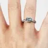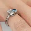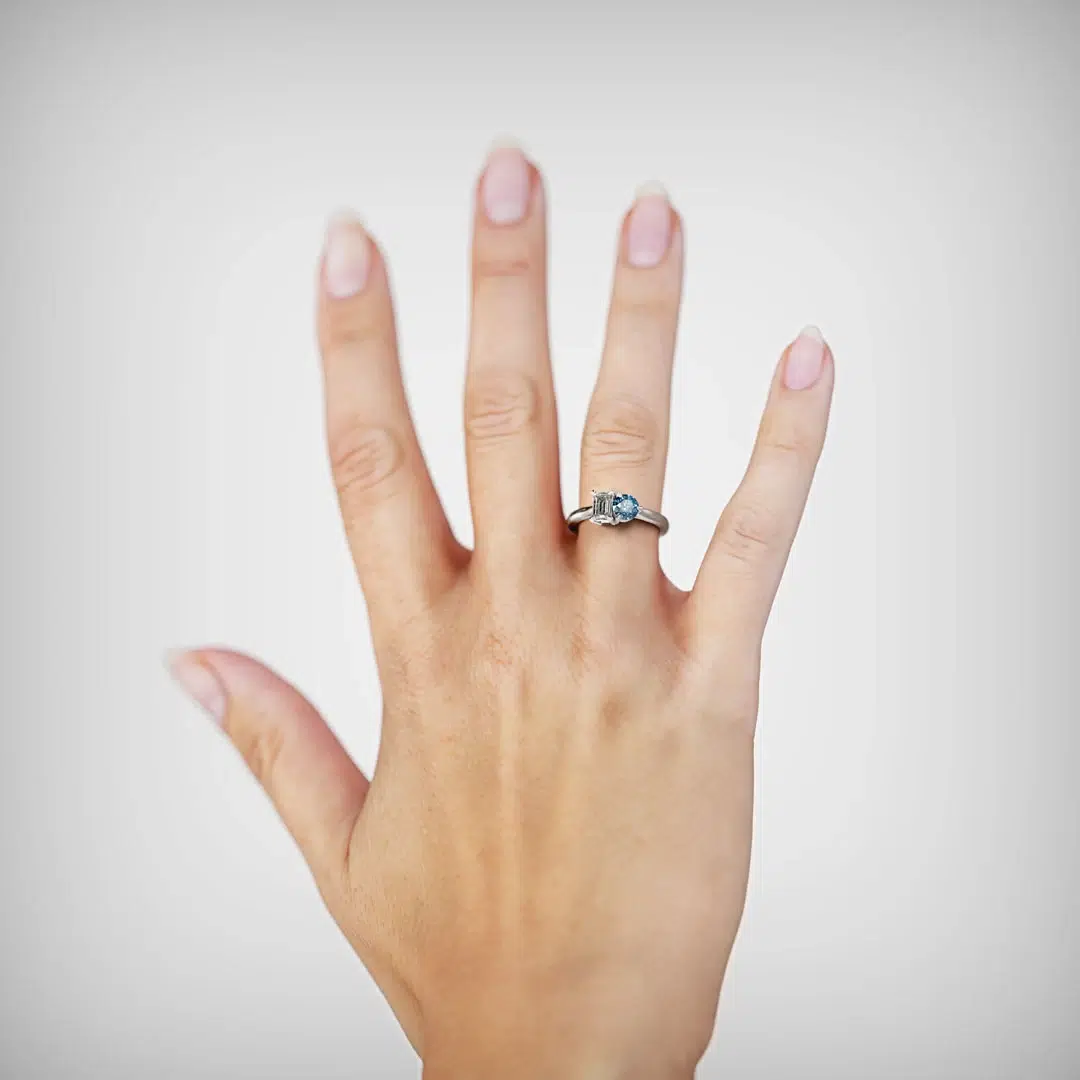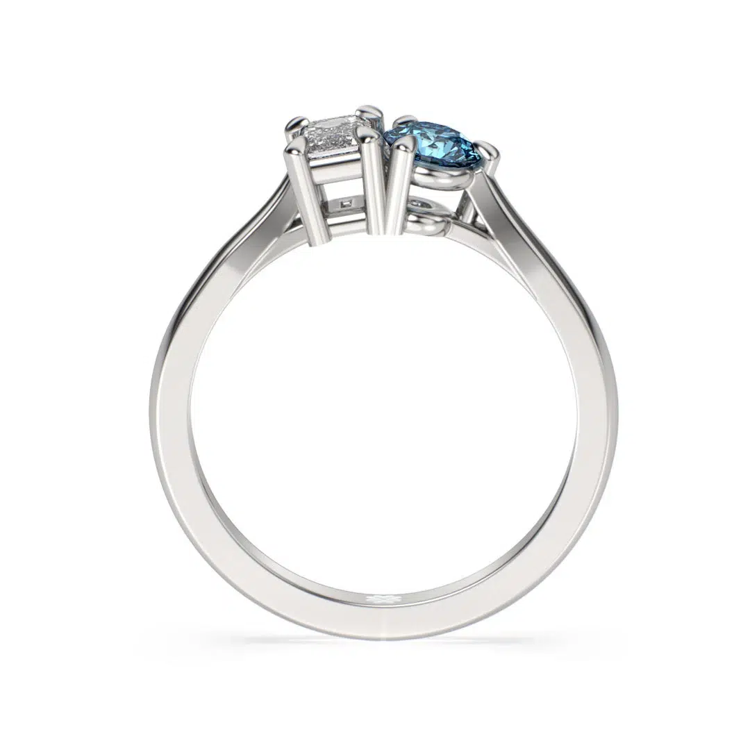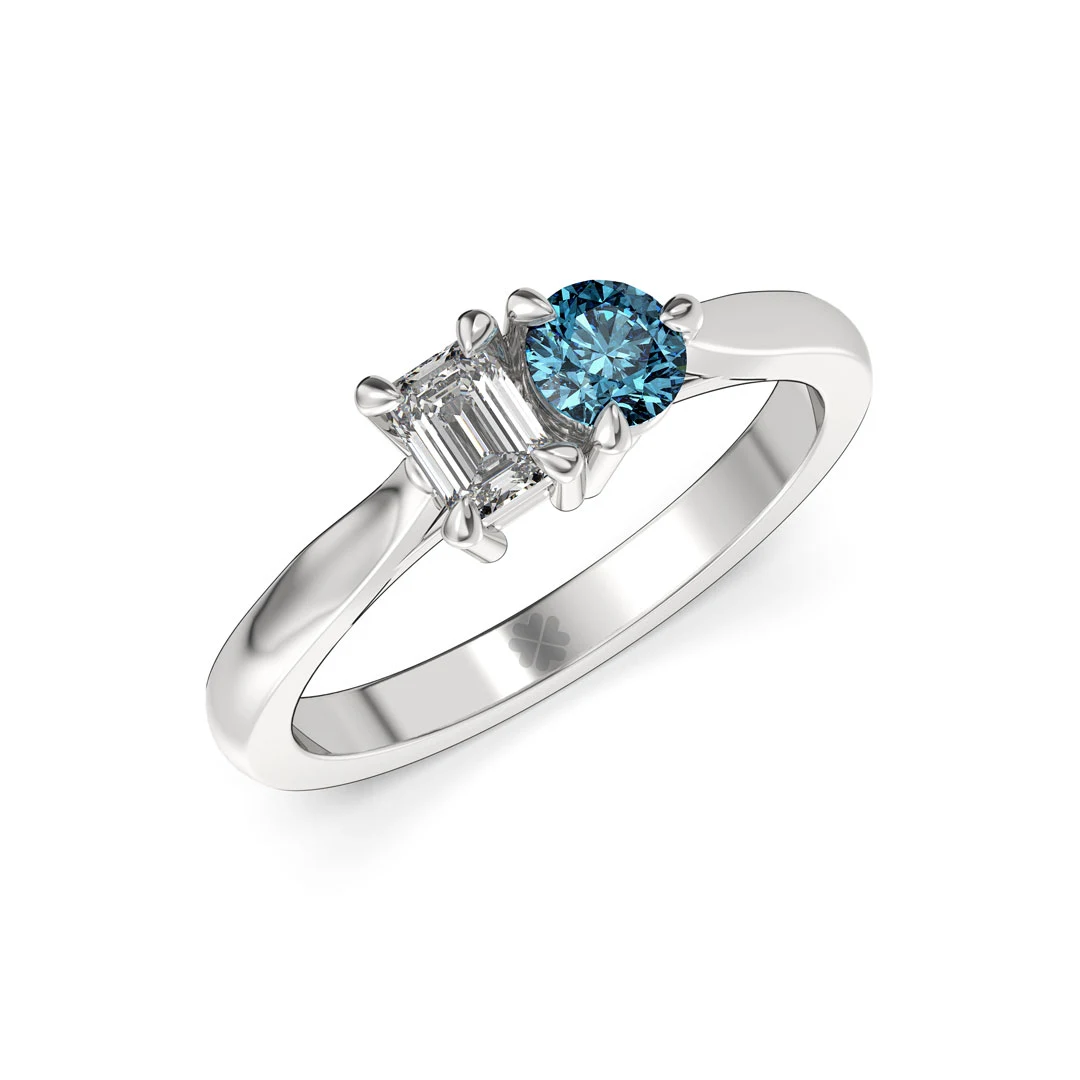 Anillo MAO Lutum Blue Platino 950 Responsable: modernidad y unión con un toque vibrante Un solitario moderno, con un diamante corte esmeralda y un diamante azul corte brillante, que simbolizan la unidad y originalidad. Perfecto para la novia sofisticada que busca diseño y estilo únicos.