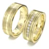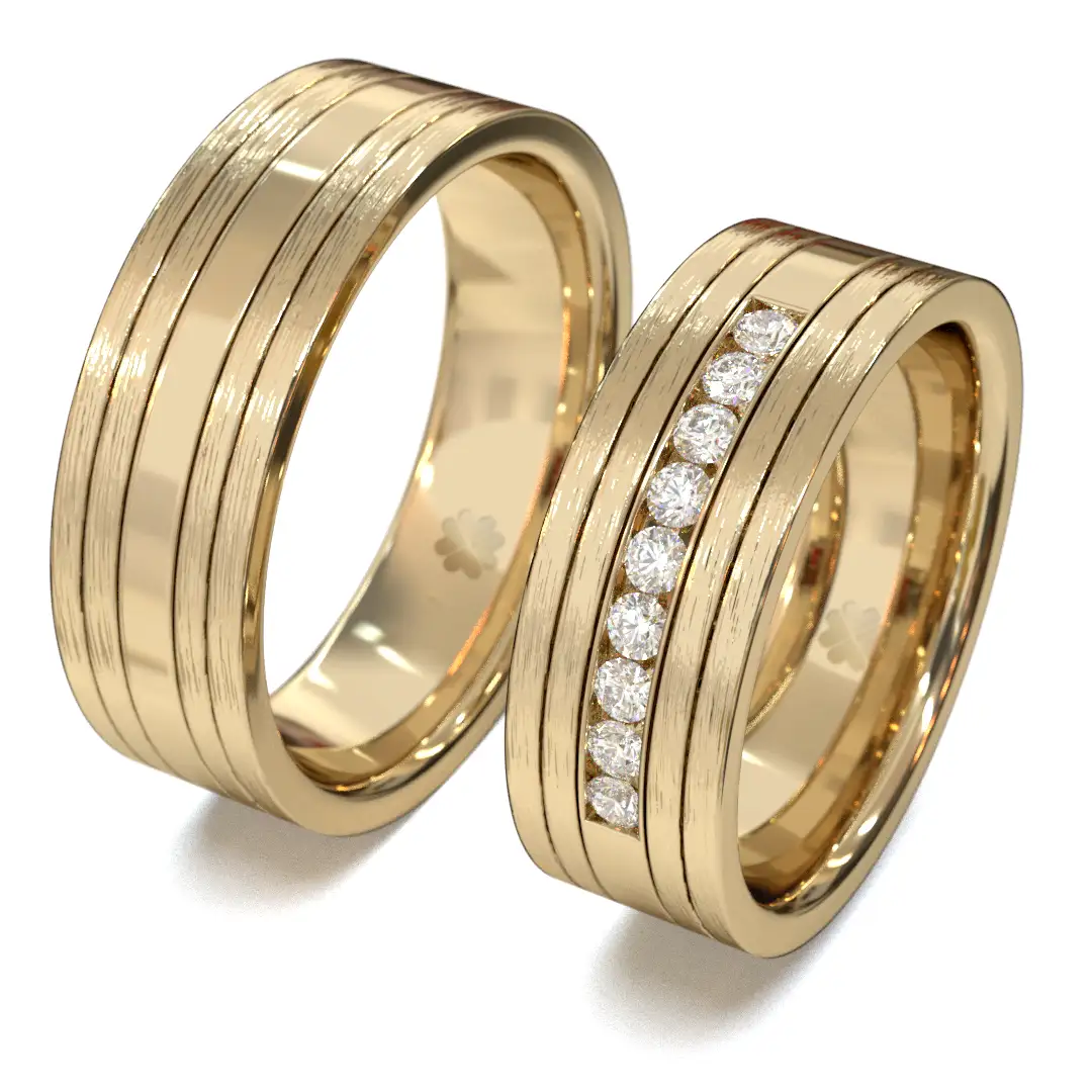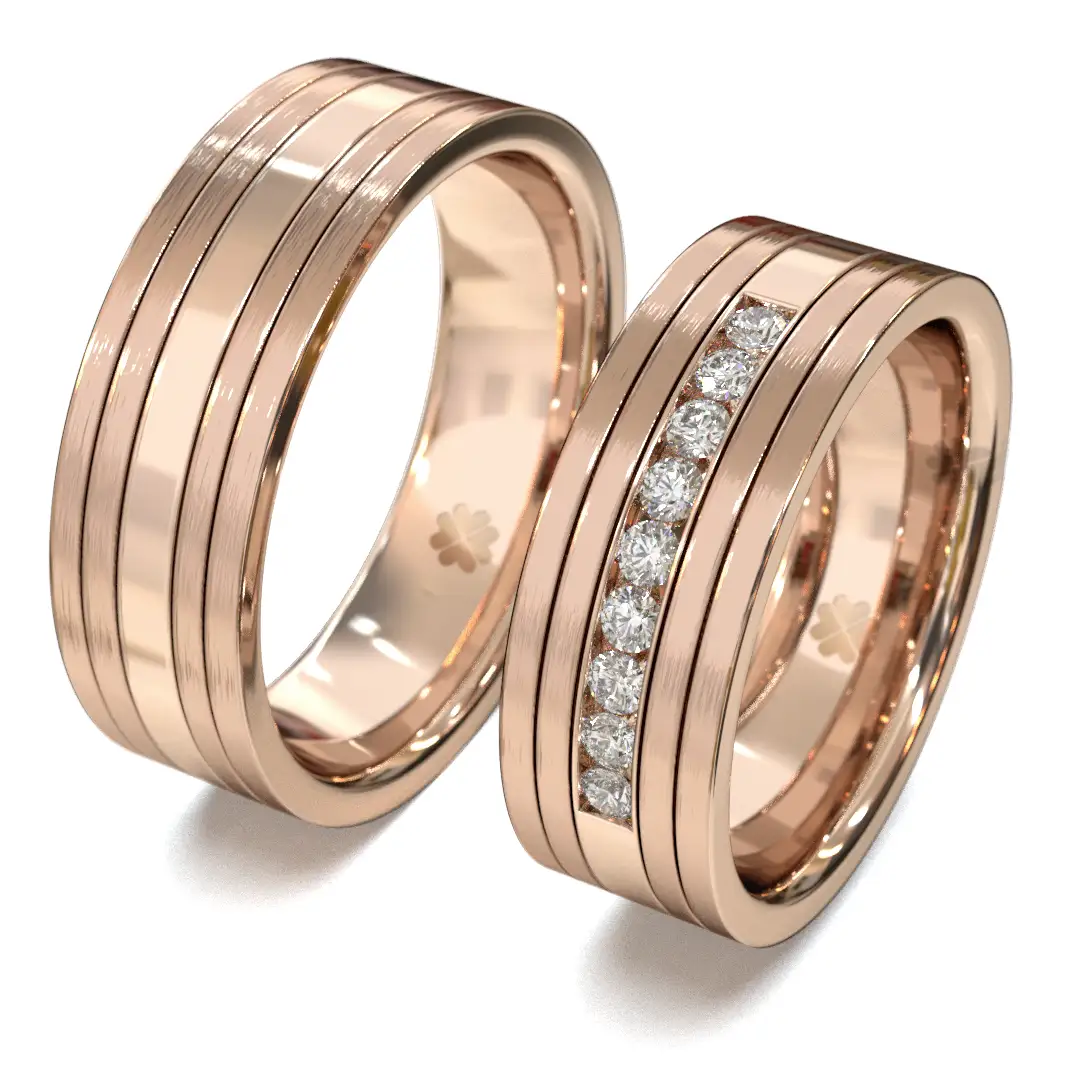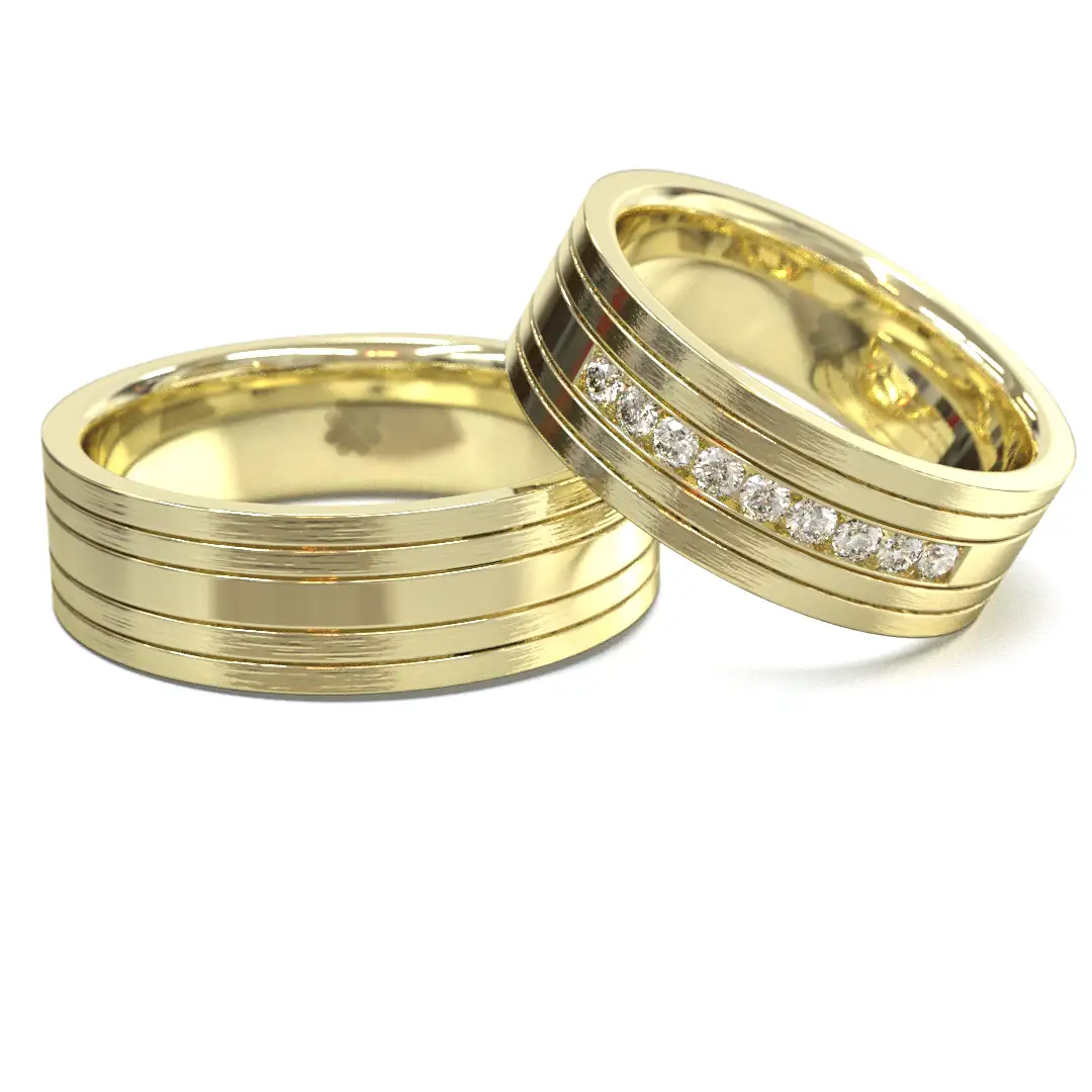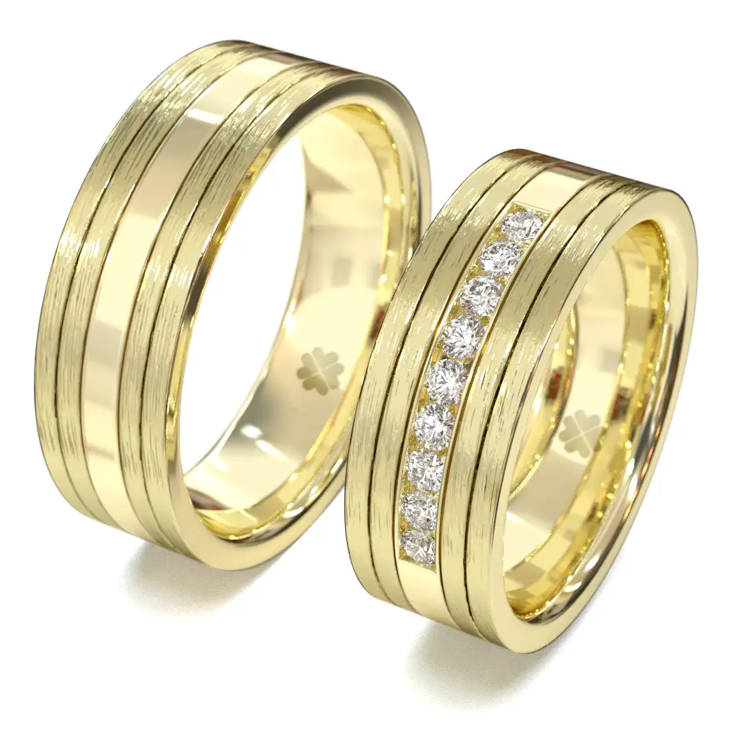 Descubre las imponentes argollas de matrimonio Constance, diseñadas para parejas que buscan presencia, equilibrio y un estilo contemporáneo con identidad propia. Estas argollas presentan un cuerpo plano de 6,5 mm de ancho, realzado por finas líneas paralelas que recorren su superficie y crean un elegante contraste entre texturas satinadas y bordes pulidos. En la argolla de la novia, una línea central delicadamente engastada con diamantes de corte brillante aporta un destello definido y sofisticado, integrándose con armonía al diseño estructurado. Fabricadas en oro 18kt, las argollas Constance combinan carácter, durabilidad y una estética atemporal pensada para acompañarlos toda la vida. Un diseño sólido que simboliza constancia y unión duradera.
