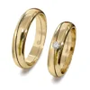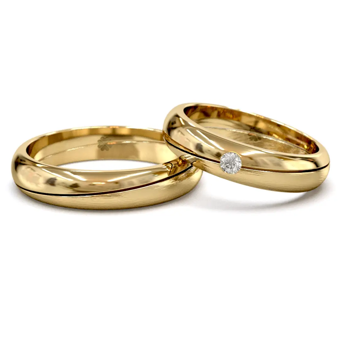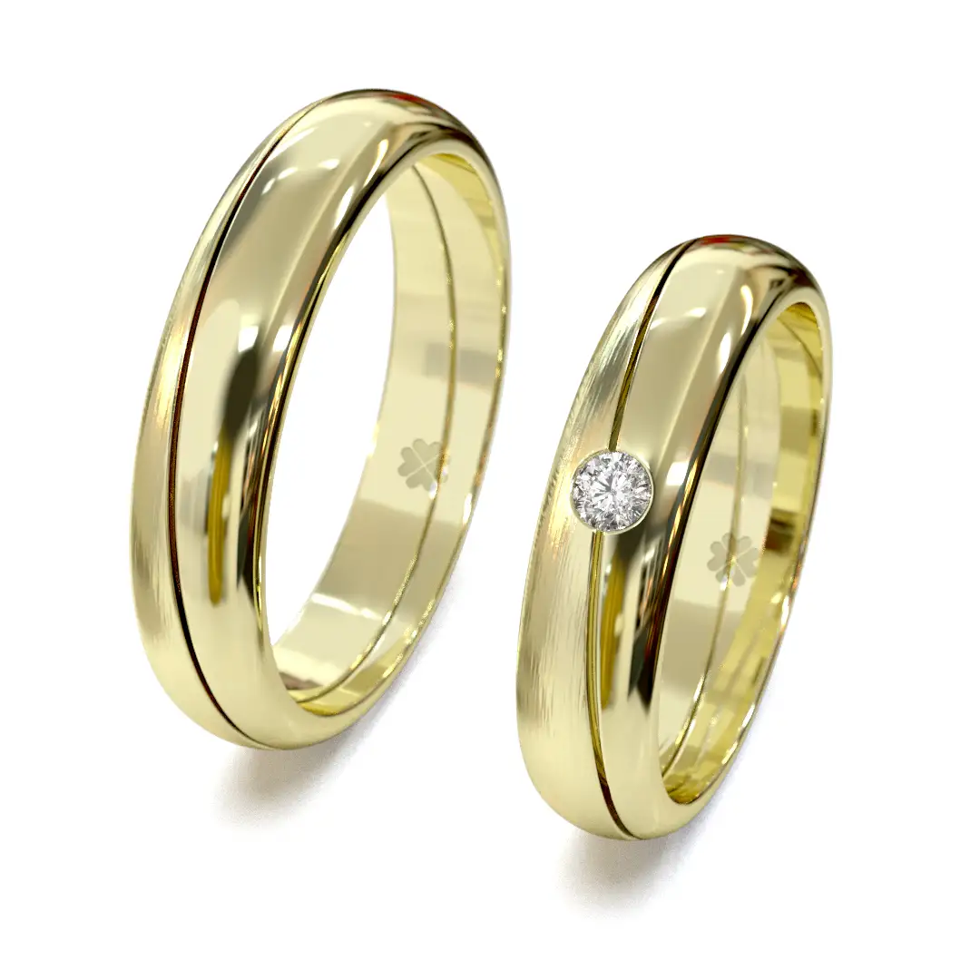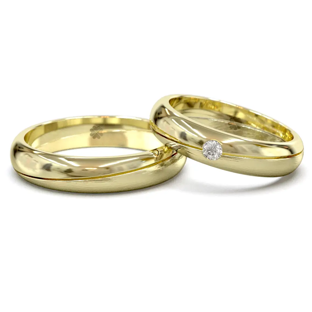 Descubre las elegantes argollas de matrimonio Dualite Inglés, creadas para parejas que buscan un diseño clásico con un contraste sutil y sofisticado. Estas argollas presentan un perfil inglés de 4,5 mm de ancho, suavemente redondeado para brindar máxima comodidad, acompañado de una delicada línea central que divide la superficie y genera un juego de luz refinado entre planos pulidos. En la argolla de la novia, un diamante de corte brillante cuidadosamente engastado se integra con armonía al diseño, aportando un destello protagonista y atemporal. Fabricadas en oro 18kt, las argollas Dualite Inglés combinan equilibrio, elegancia y durabilidad para acompañarlos toda la vida.