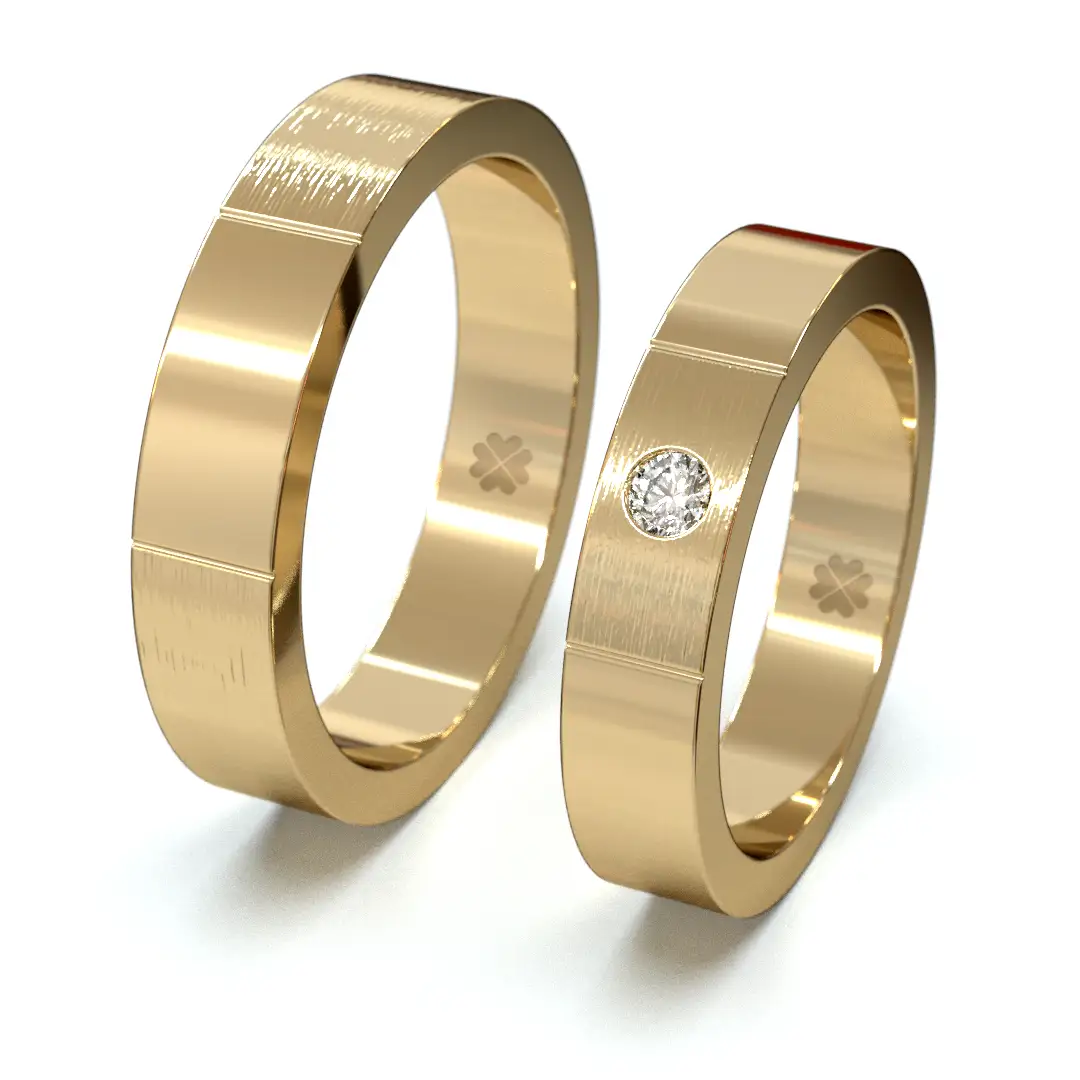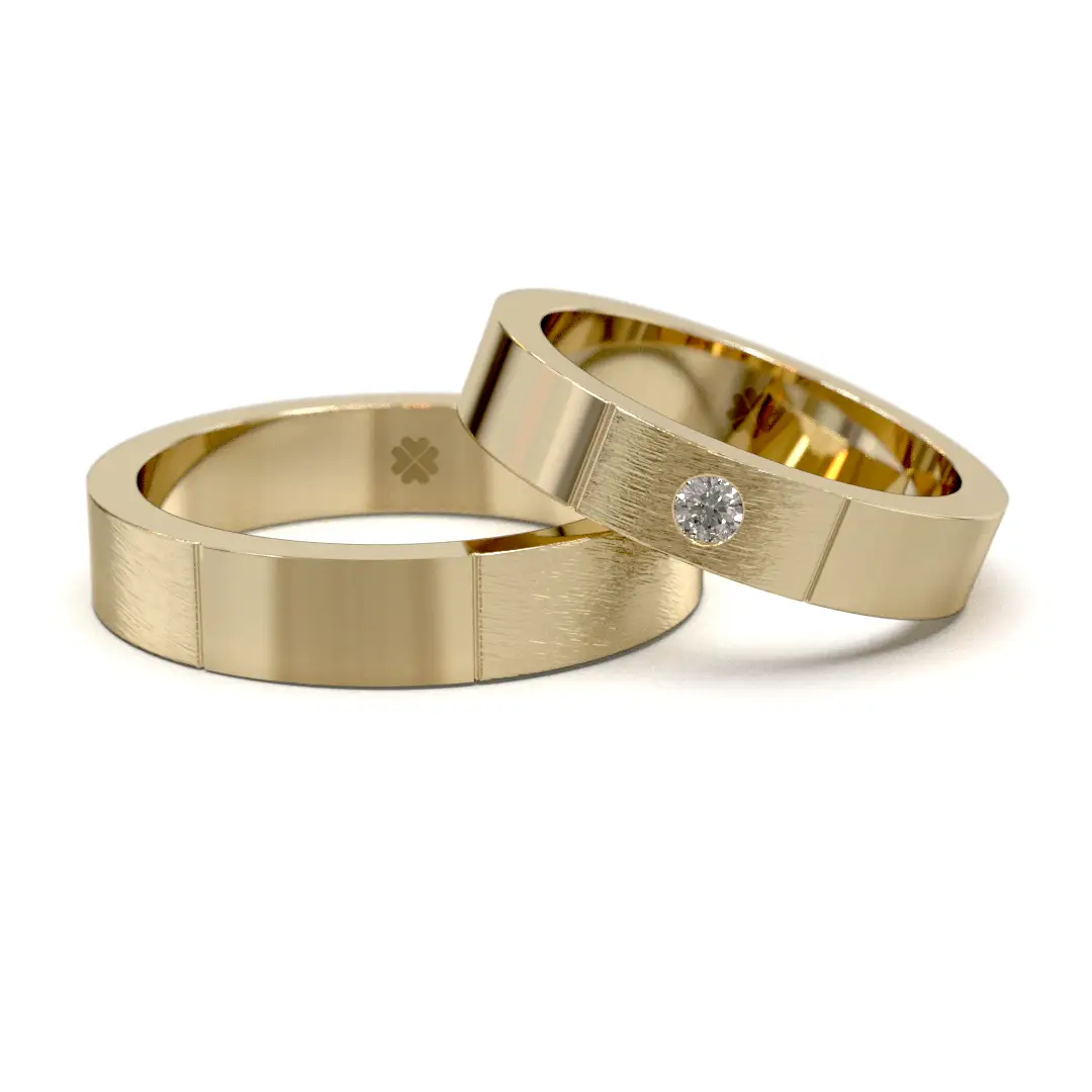 Descubre las elegantes argollas de matrimonio Tu y Yo, diseñadas para simbolizar la unión de dos historias que avanzan juntas en perfecta armonía. Estas argollas presentan un diseño de líneas limpias y definidas, donde planos pulidos y superficies satinadas se alternan sutilmente, creando un equilibrio moderno y sofisticado. En la argolla de la novia, un diamante de corte brillante cuidadosamente engastado se convierte en el punto focal del diseño, representando ese encuentro único que transforma dos caminos en uno. Fabricadas en oro 18kt, las argollas Tu y Yo combinan carácter, elegancia y durabilidad para acompañarlos toda la vida.